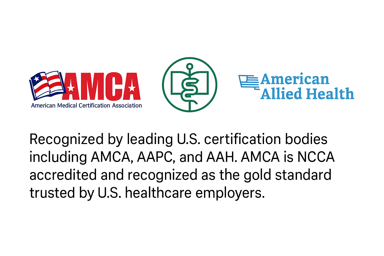 Recognized by leading U.S. certification bodies including American Medical Certification Association (AMCA), American Academy of Professional Coders (AAPC), and American Allied Health (AAH).AMCA is accredited by the National Commission for Certifying Agencies (NCCA) and recognized as a gold standard trusted by U.S. healthcare employers.